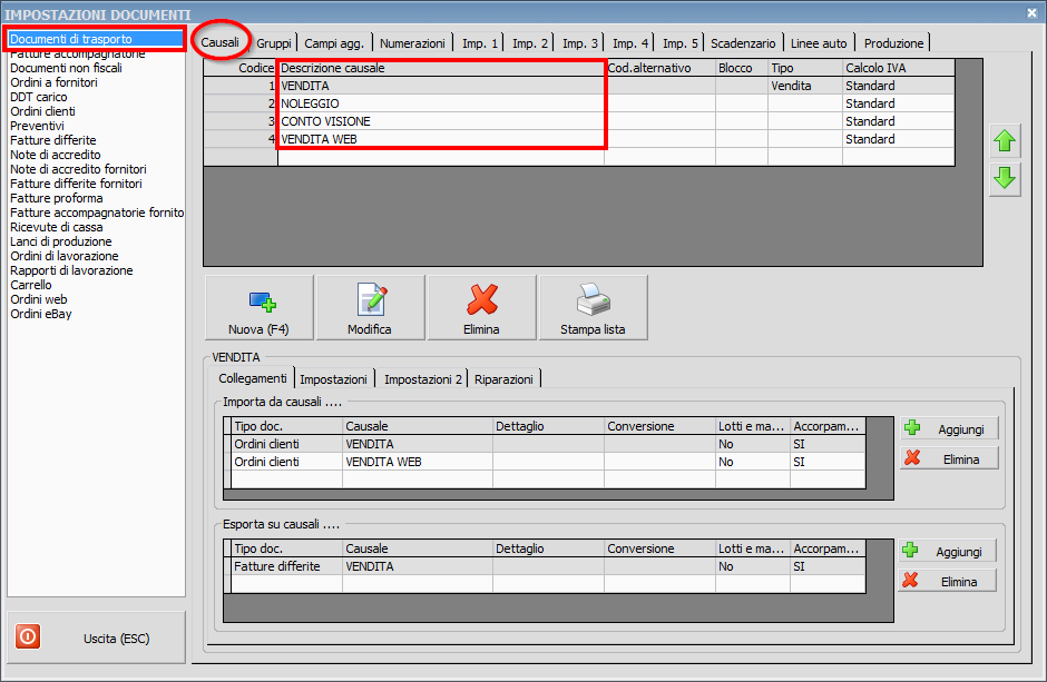 Nella sezione Causali è possibile modificare le causali utilizzabili per ogni documento.